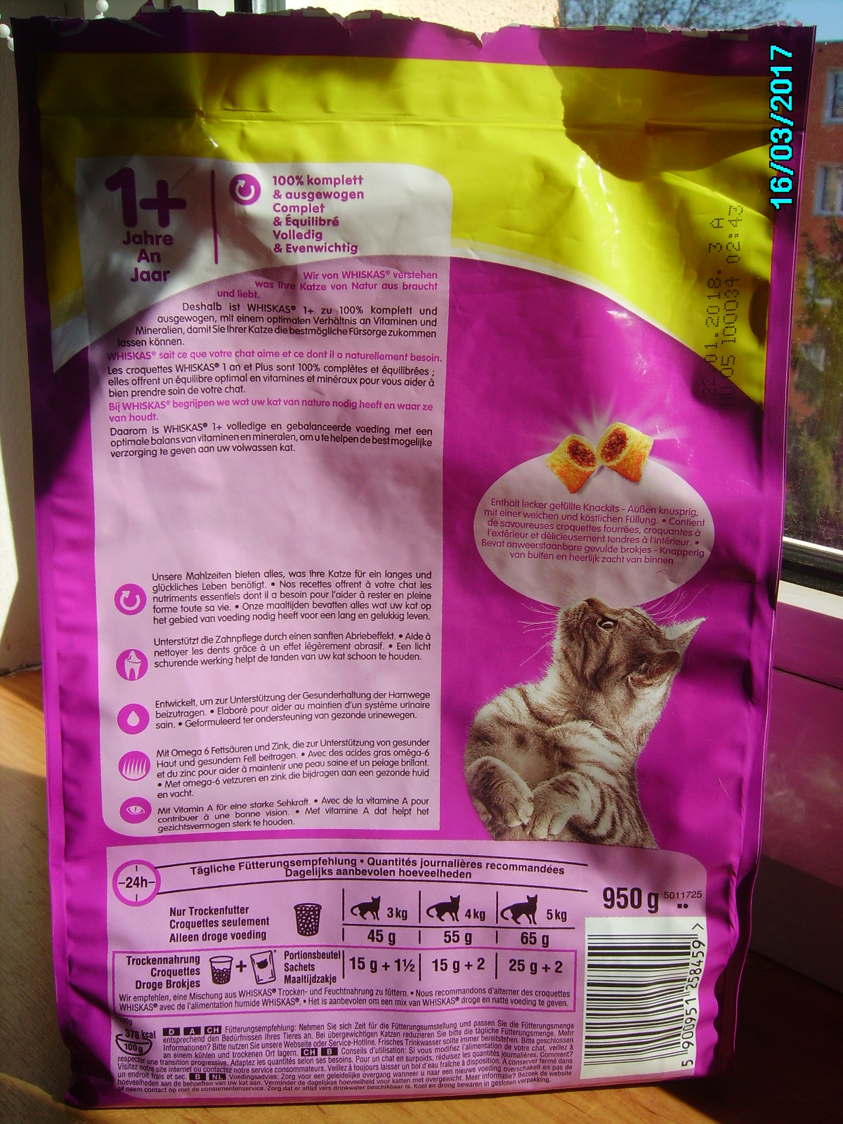 V tom ti asi nebudu moci vyhovět. Kupujeme to v Německu (české Whiskas není tak dobré a kočičáci s ním mají problémy, občas ho nechtějí) a přímo složení na obalu není.