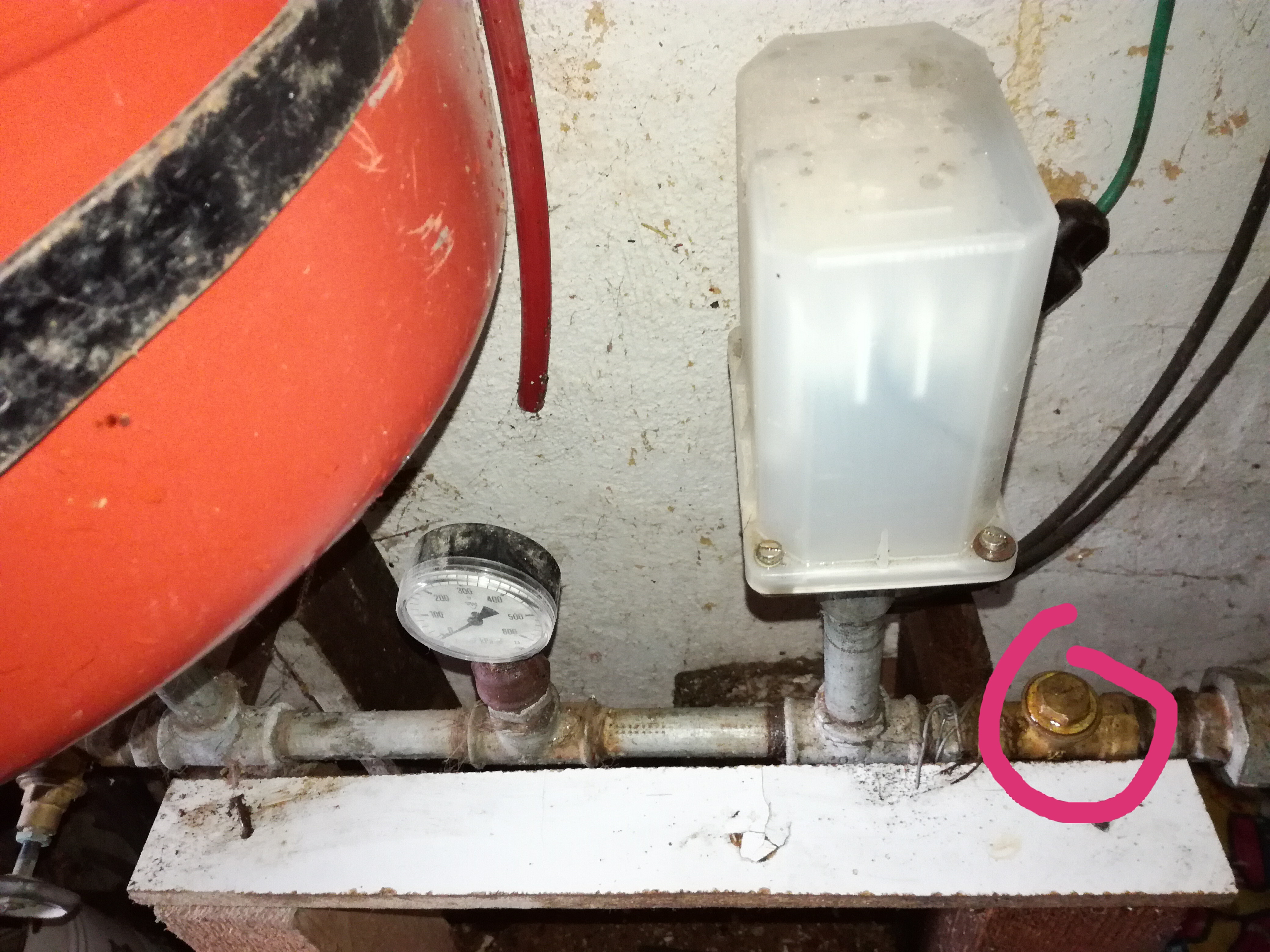 Čerpadlo je opravdu dole ve studni. vytáhl jsem ho a bylo asi 20 metrů ponořené ve vodě. Vody je tam dost. Od studny je to ještě dalších asi 15 metrů do sklepa. Celková délka hadice od malyše ve studně do sklepa je asi 35 m. Ten šroub označený na obrázku jsem odšrouboval a stříká z něj vysokým tlakem voda. Do té nádoby už ale voda neprojde. Nejspíš bude problém někde mezi tím šroubem a tou nádrží červenou. Zítra tam budu tak ten šroub vyšroubuju a pošlu fotku co je uvnitř. Vždy to fungovalo normálně ale teď se to 10 let nepoužívalo.