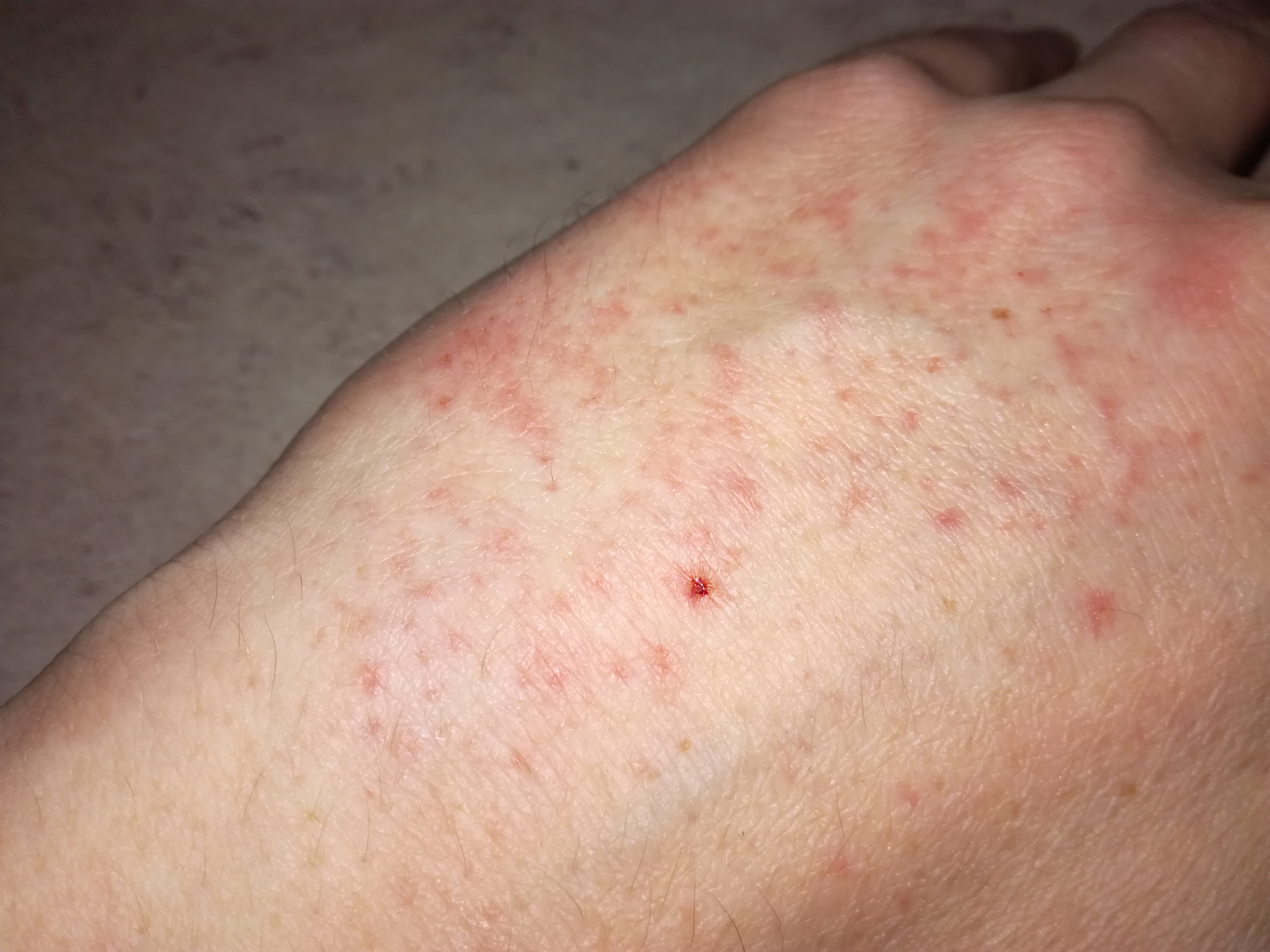 Najednou jsem si všiml že mám červené tečky na ruce. Ještě ráno to tam nebylo. Může to být tím že jsem šel několik hodin v mrazu? Nesvědí to ani nepálí.